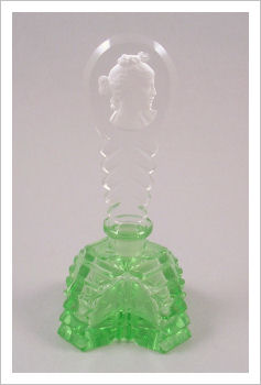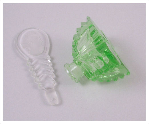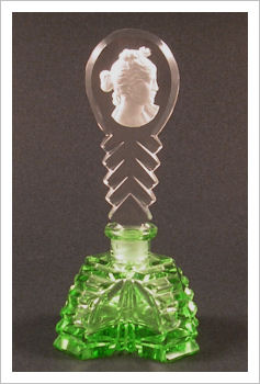 It's very tall and slender at 5 and 5/8 inches high with a clear stopper and delicate green base. These Czech perfume bottles are difficult to photograph. They change colors and sparkle when the light hits them and the photos just don't do them justice,
